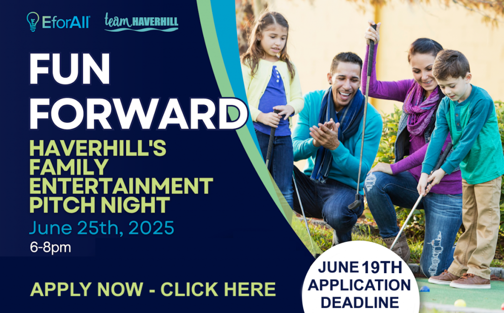 Team Haverhill and EforAll Merrimack Valley are pleased to present: Fun Forward, an exciting live pitch contest inviting entrepreneurs, creatives, and visionaries to share their boldest ideas for a family-focused entertainment space — right here in Haverhill!
